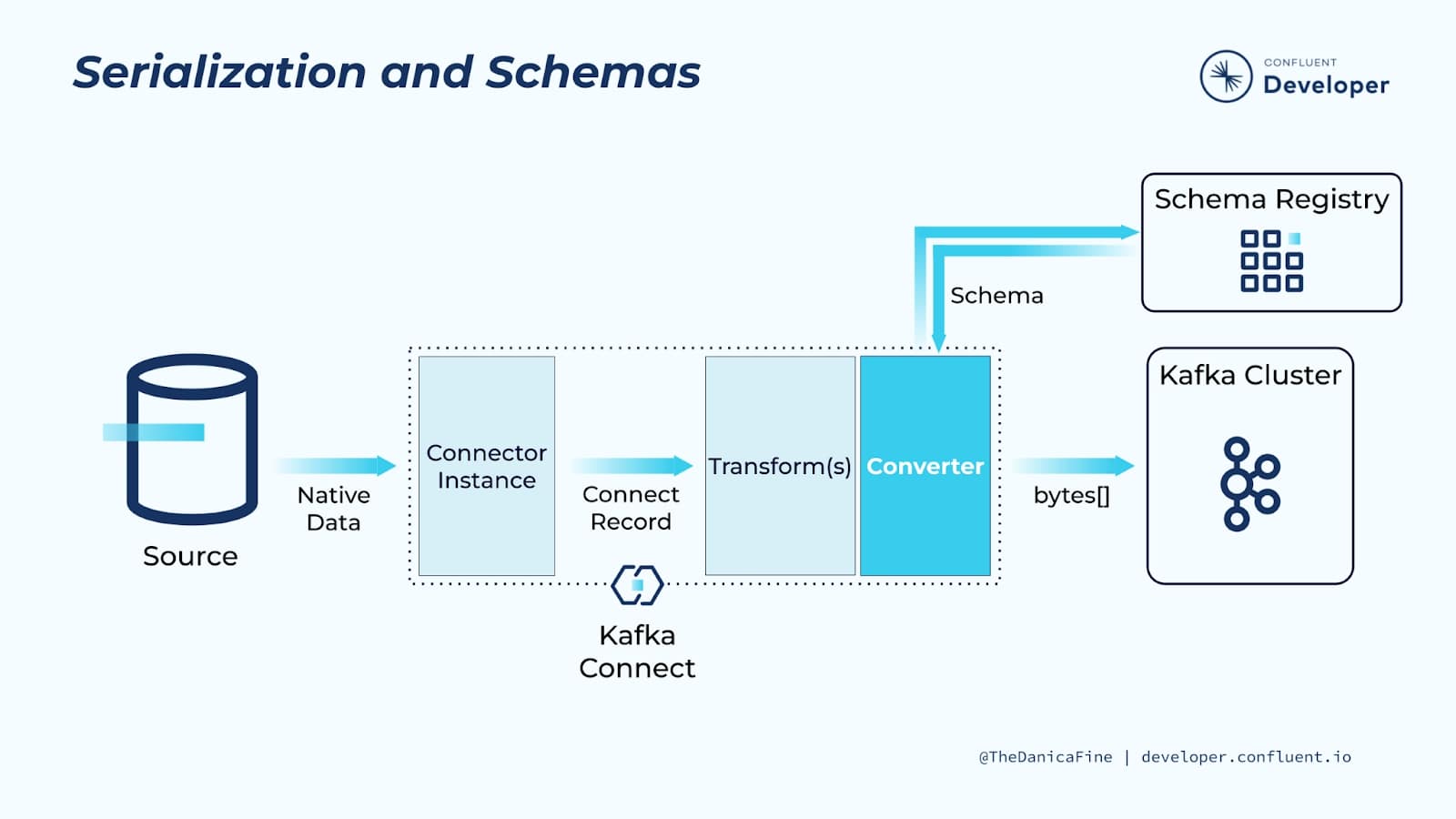 Converters는 특정 데이터 format으로 데이터를 카프카로 읽거나 쓸때 사용된다. (Serialization/Deserialization)
